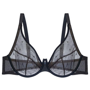 Ultra-deep plunge bra has a drop-down front detail with exposed central gore. Wires are covered with satin for luxurious comfort, whilst transparent tulle lines the embroidered cups to add support without compromising the sheer effect.