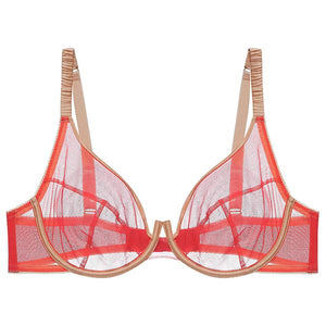 Bright pink tulle bra has a high apex cup style and dramatic cut out front for the ultimate deep plunge. Pale vintage rose satin trim to strap, cup and wire.