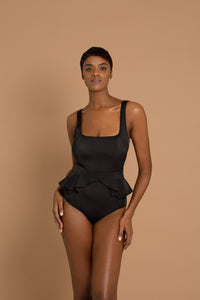 Our Antigua one-piece gives you two looks in one. A modern square neck tank suit with flattering scooped leg (cut to look great on every body shape and size!) features a detachable belt with pleated peplum waist detail. Pop this baby on for an instant hourglass effect!